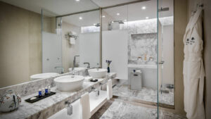 Номера обставлены лаконично и элегантно: мягкое освещение, свежая палитра, дымчатое матовое стекло вокруг ванной комнаты. Окна с качественной шумоизоляцией не позволяют городской суете мешать отдыху гостей.